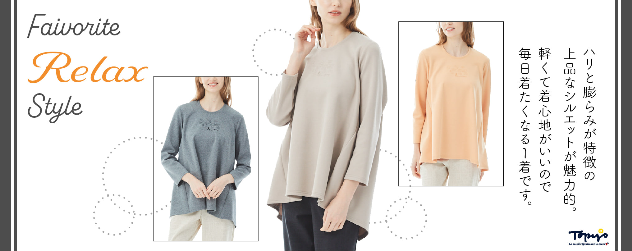 着心地を最優先に、流行にとらわれず、オフタイムを楽しむ、大人の女性のカジュアルウェアを提案します。 Topysブランドの展開レギュラーサイズは、40号(11~13号)になります。 |