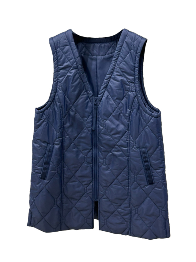 ラフ過ぎないよう女性らしいシルエットに仕上げたキルティングベスト。