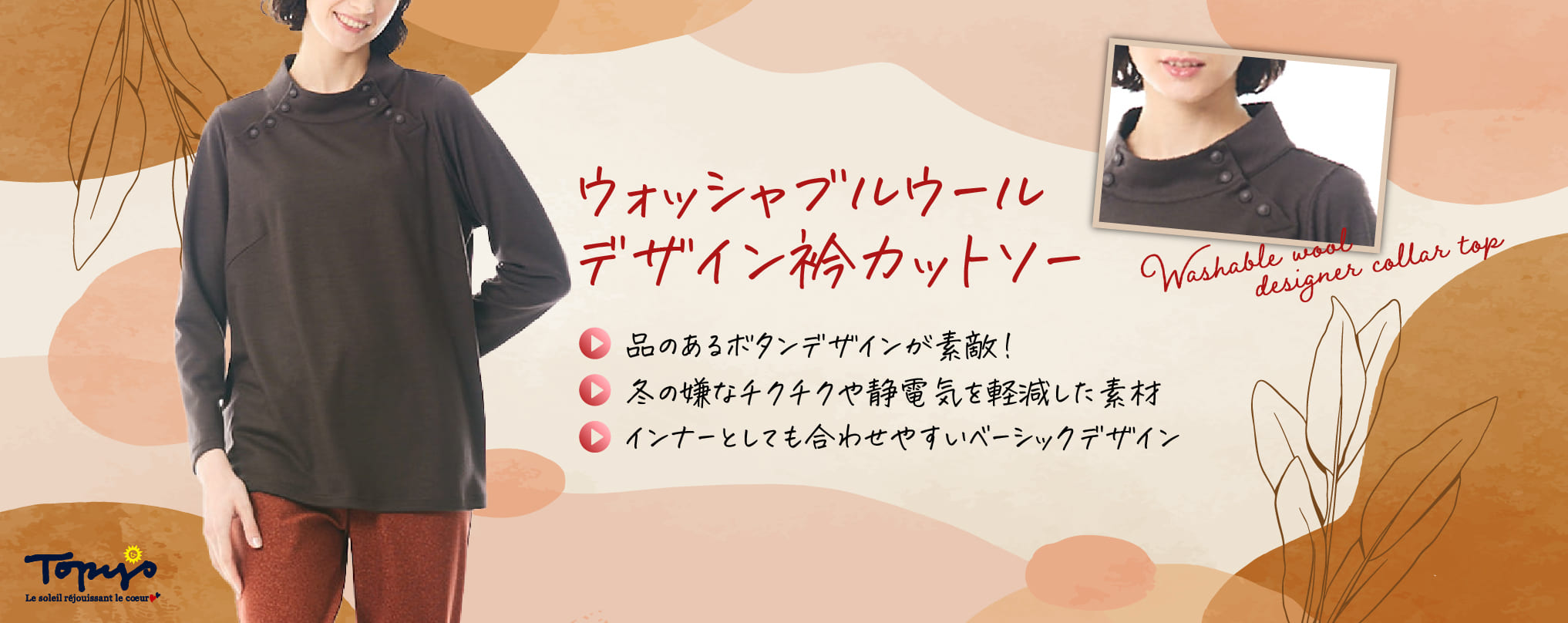 着心地を最優先に、流行にとらわれず、オフタイムを楽しむ、大人の女性のカジュアルウェアを提案します。 Topys Plusブランドの展開レギュラーサイズは、46号(15~17号)になります。 40号サイズ(11~13号)の商品は、Topysコーナにて販売しております。 |