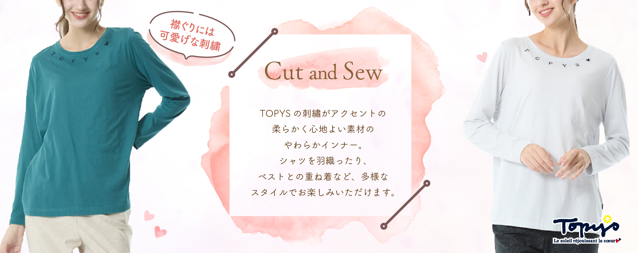 襟ぐりにはTOPYSにハートの入った可愛げな刺繍が施されています。