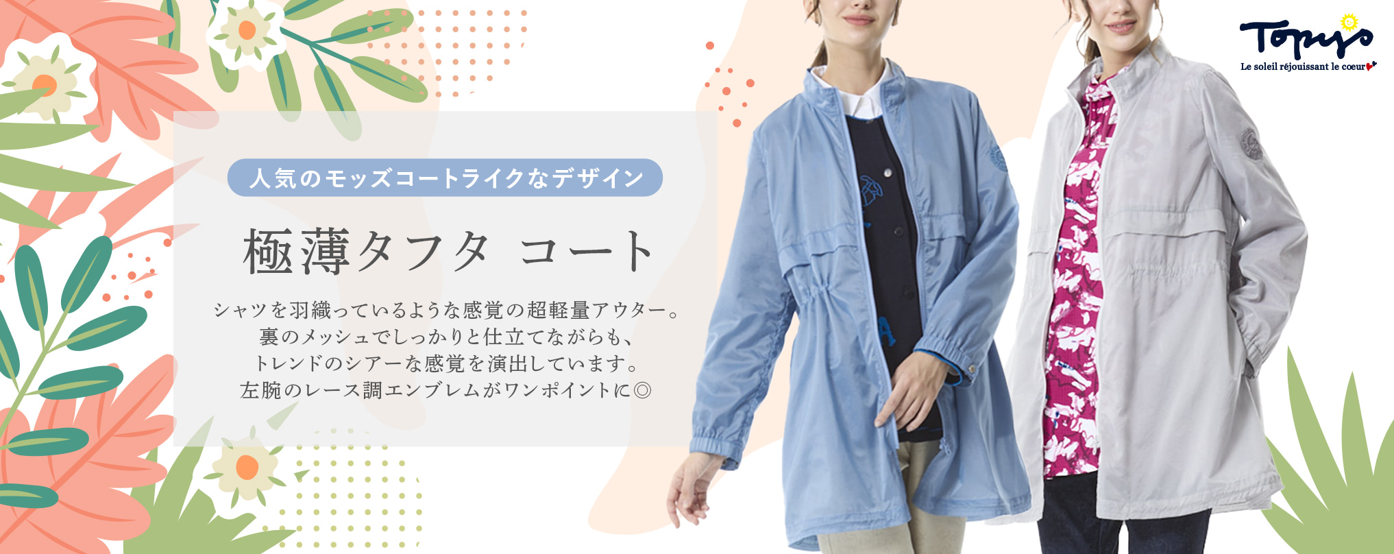 着心地を最優先に、流行にとらわれず、オフタイムを楽しむ、大人の女性のカジュアルウェアを提案します。 Topysブランドの展開レギュラーサイズは、40号(11~13号)になります。 |