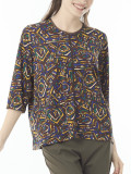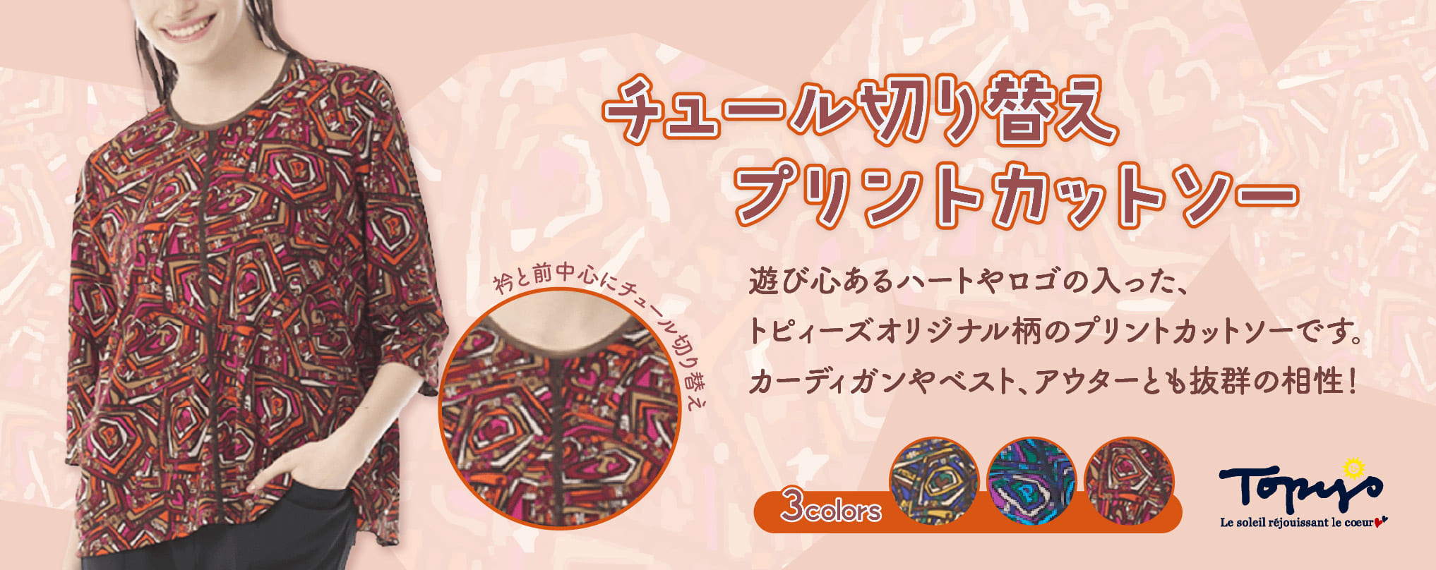 ポリエステル強撚スムースをプリント下に使用しています。幾何柄をトピィーズらしく表現した柄でプリントをしています。