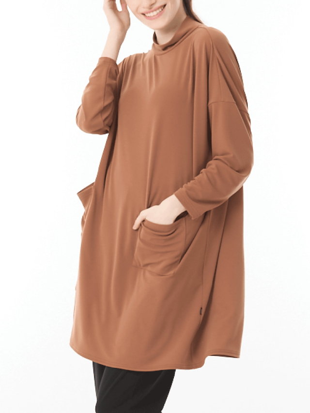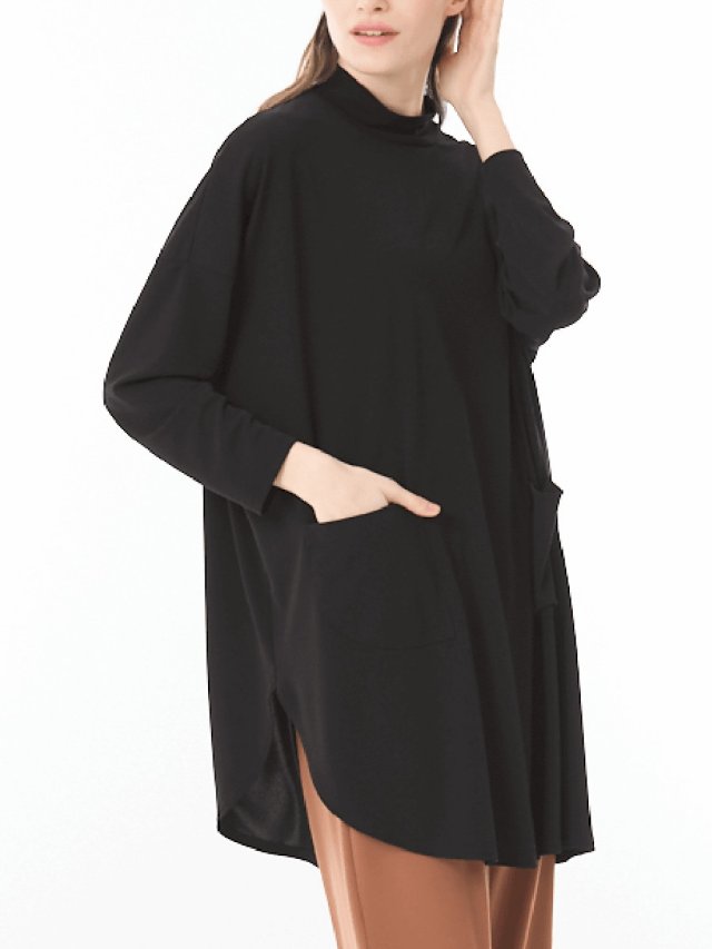 ドレープが綺麗に見えるスムース生地を使用しています。右側に丸みあるカッティングが入っており、一枚でお洒落見えが叶います。