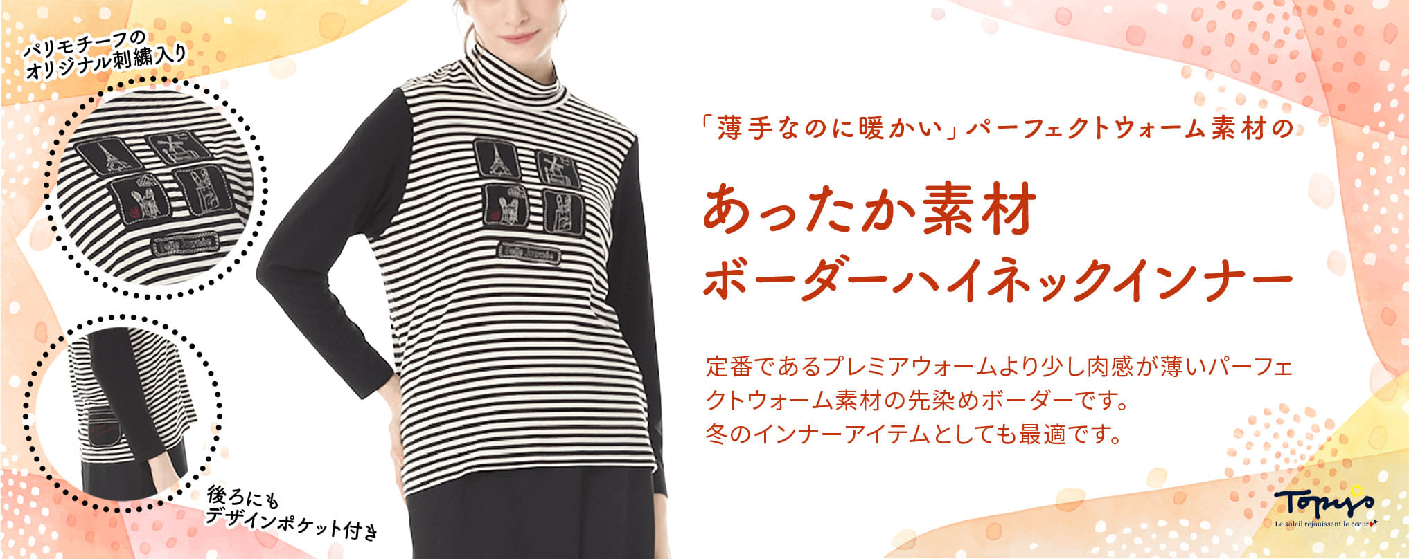 一枚着としても、これからの寒い季節のインナーとしても使えるプレミアムウォームの人気素材です。 胸には、トピィーズらしい可愛げなパリの刺繍が入っています。