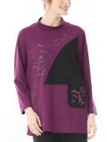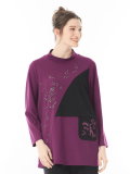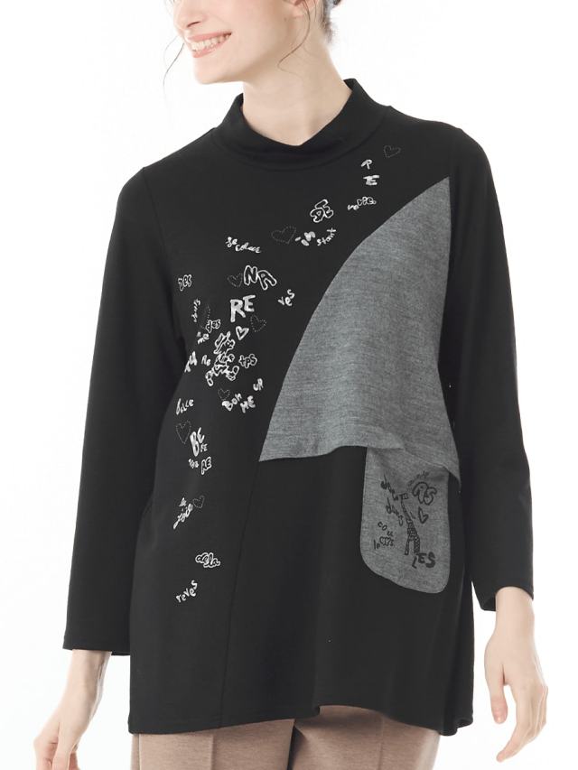 バイカラーの配色切り替えと、流れるようなロゴプリントがお洒落なチュニックカットソー。ウール100%なので温かく、潤い加工で心地よい着心地です。