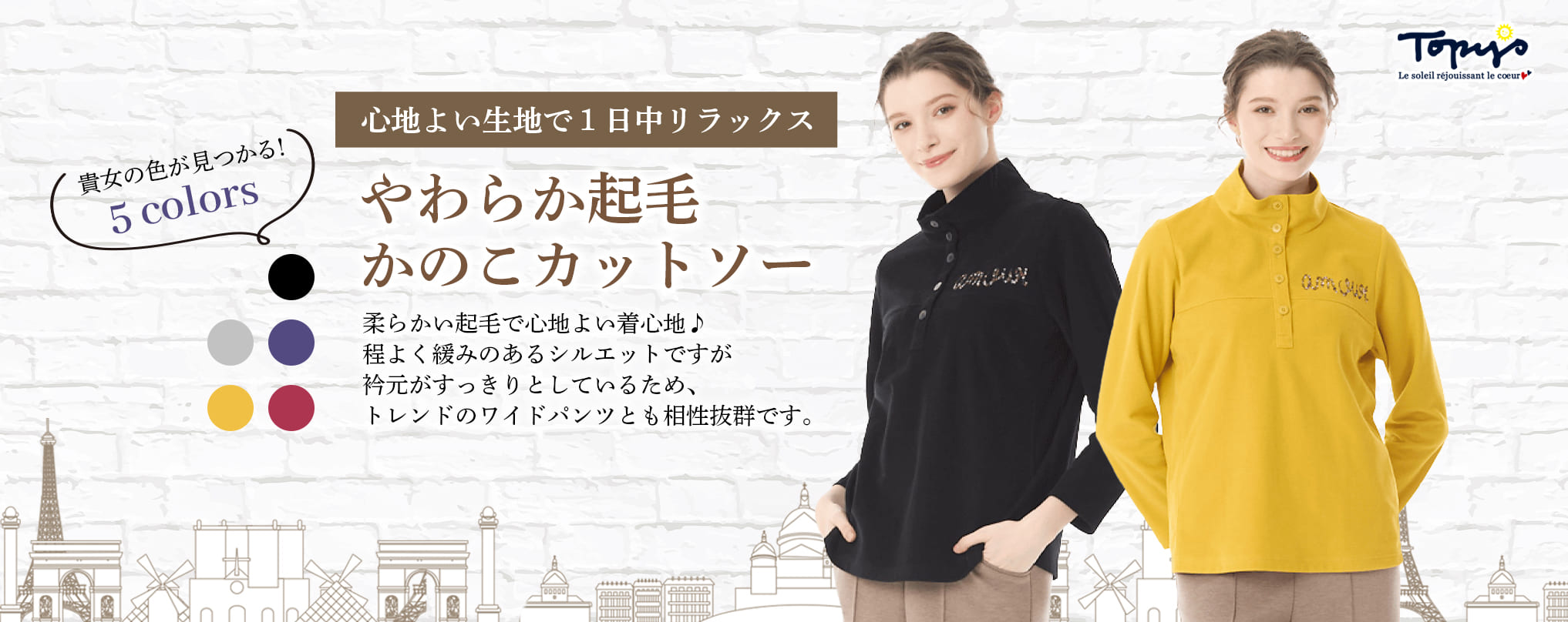 着心地を最優先に、流行にとらわれず、オフタイムを楽しむ、大人の女性のカジュアルウェアを提案します。 Topysブランドの展開レギュラーサイズは、40号(11~13号)になります。 |