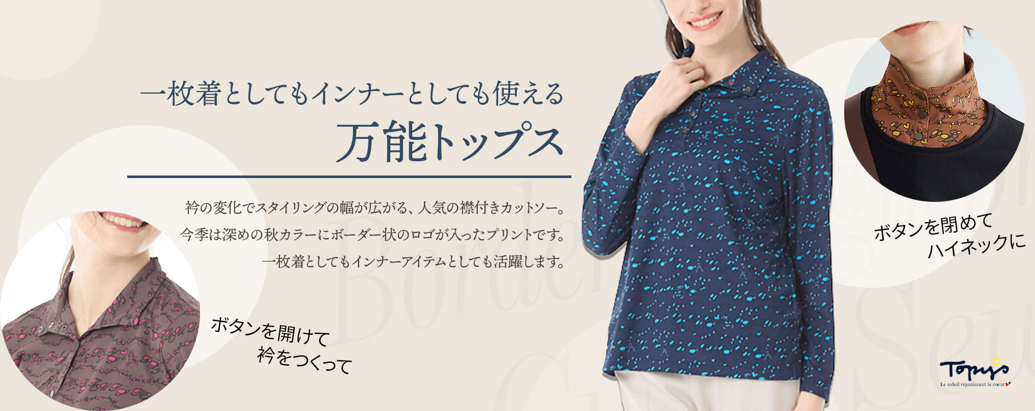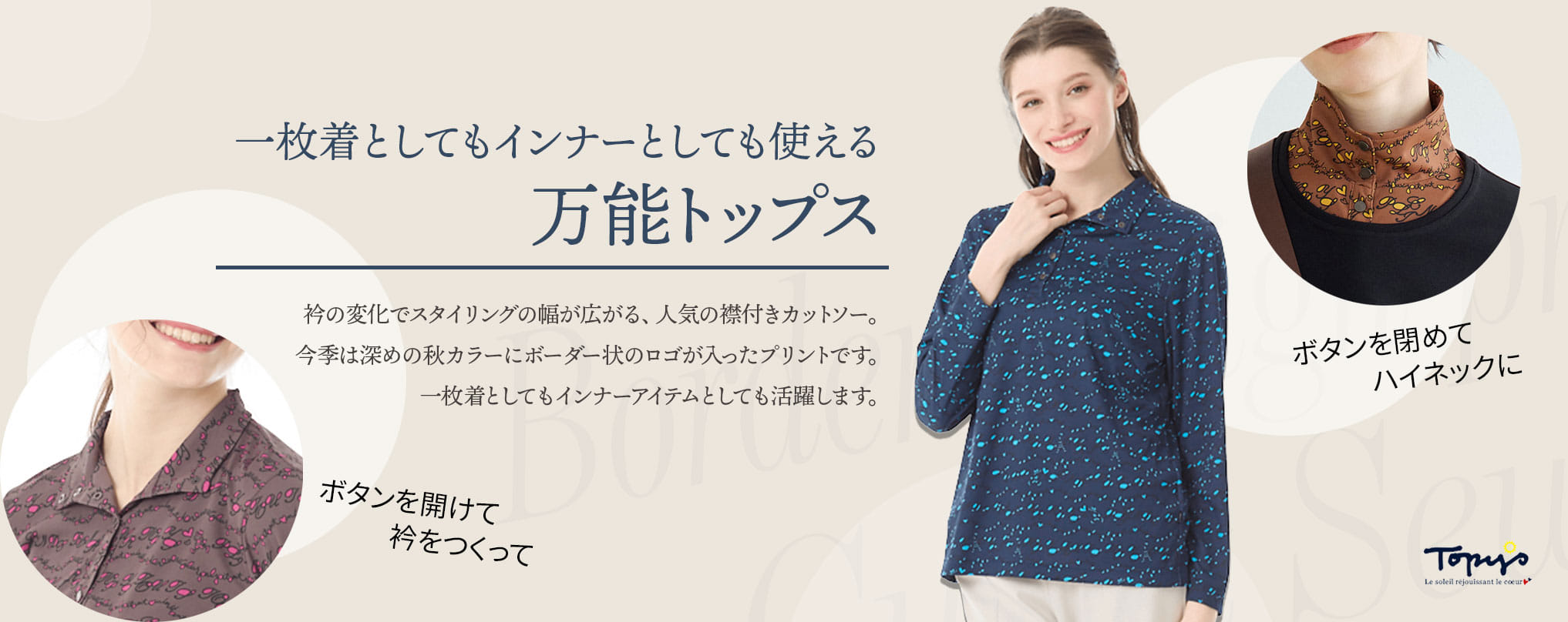 丸みあるロゴにパリモチーフのイラストをボーダー状につくった、トピィーズのオリジナルプリントです。深めのカラーで秋の装いにはぴったりです。