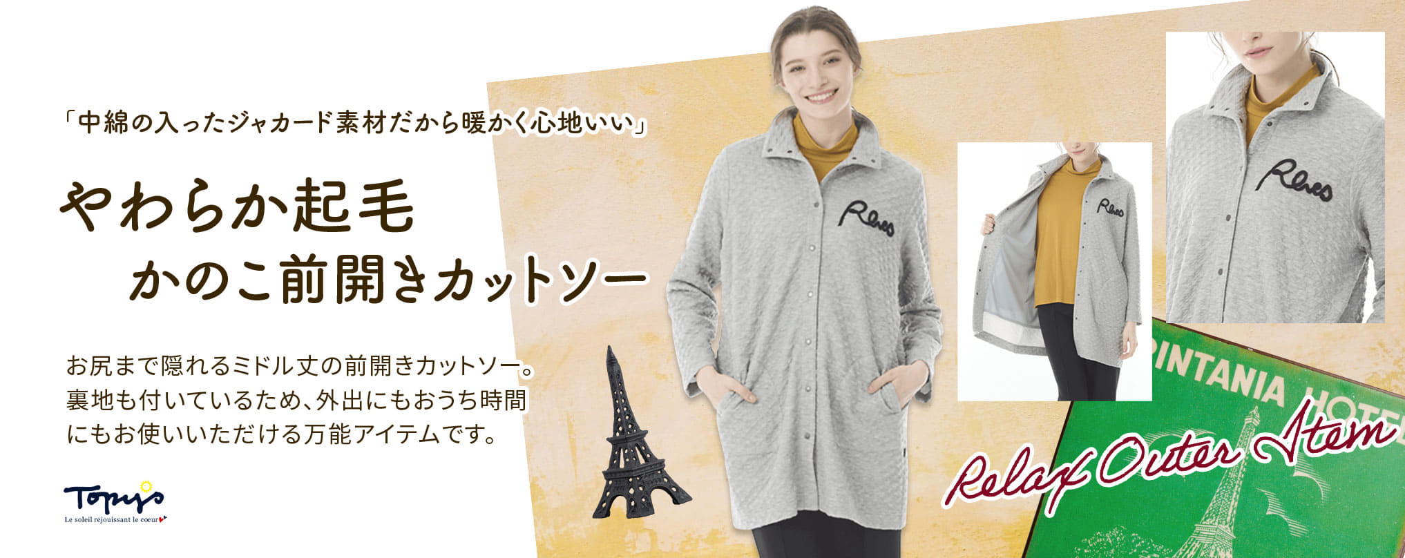 着心地を最優先に、流行にとらわれず、オフタイムを楽しむ、大人の女性のカジュアルウェアを提案します。 Topysブランドの展開レギュラーサイズは、40号(11~13号)になります。 |