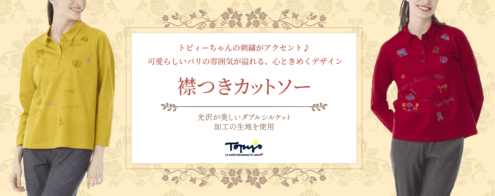 着心地を最優先に、流行にとらわれず、オフタイムを楽しむ、大人の女性のカジュアルウェアを提案します。 Topysブランドの展開レギュラーサイズは、40号(11~13号)になります。 |