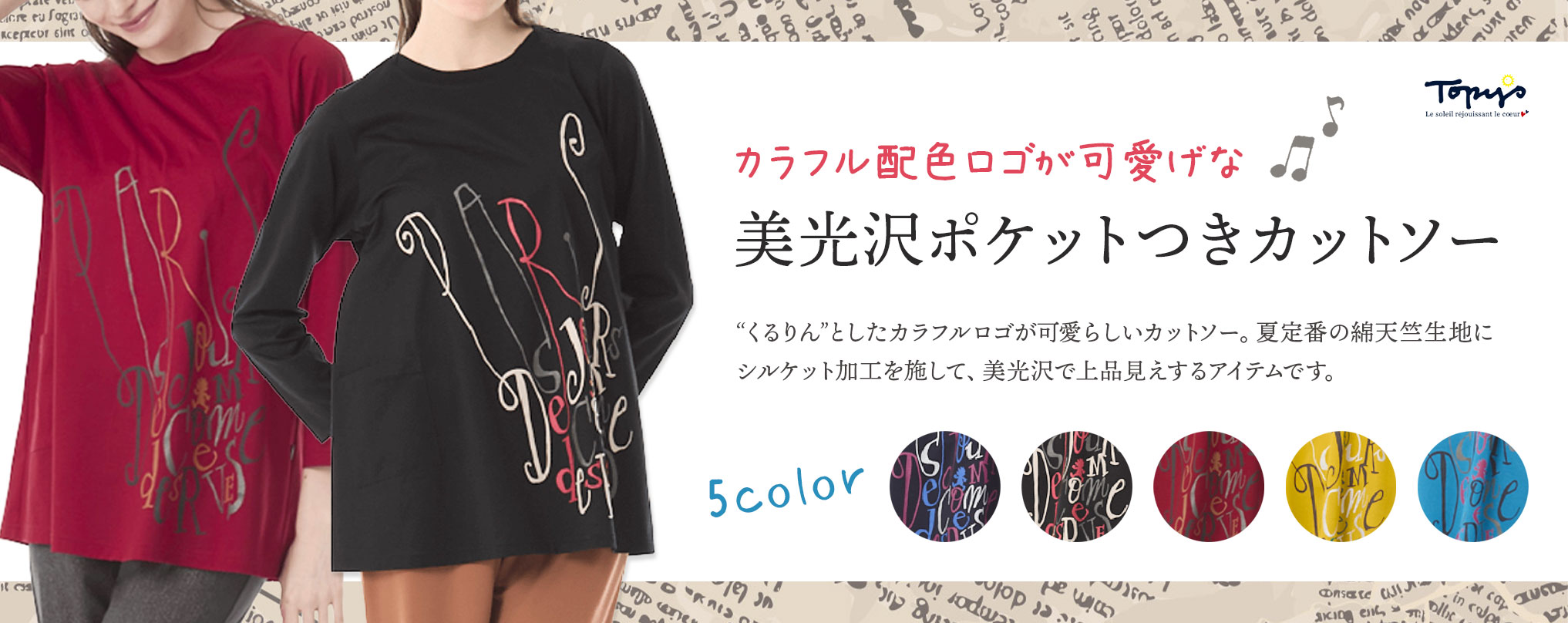 着心地を最優先に、流行にとらわれず、オフタイムを楽しむ、大人の女性のカジュアルウェアを提案します。 Topysブランドの展開レギュラーサイズは、40号(11~13号)になります。 |
