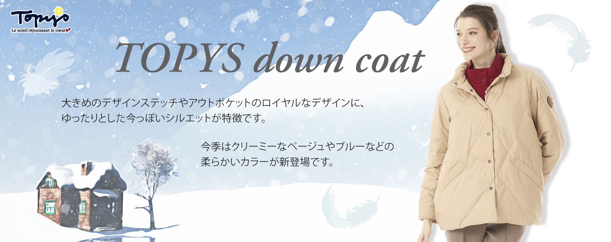 着心地を最優先に、流行にとらわれず、オフタイムを楽しむ、大人の女性のカジュアルウェアを提案します。 Topysブランドの展開レギュラーサイズは、40号(11~13号)になります。 |