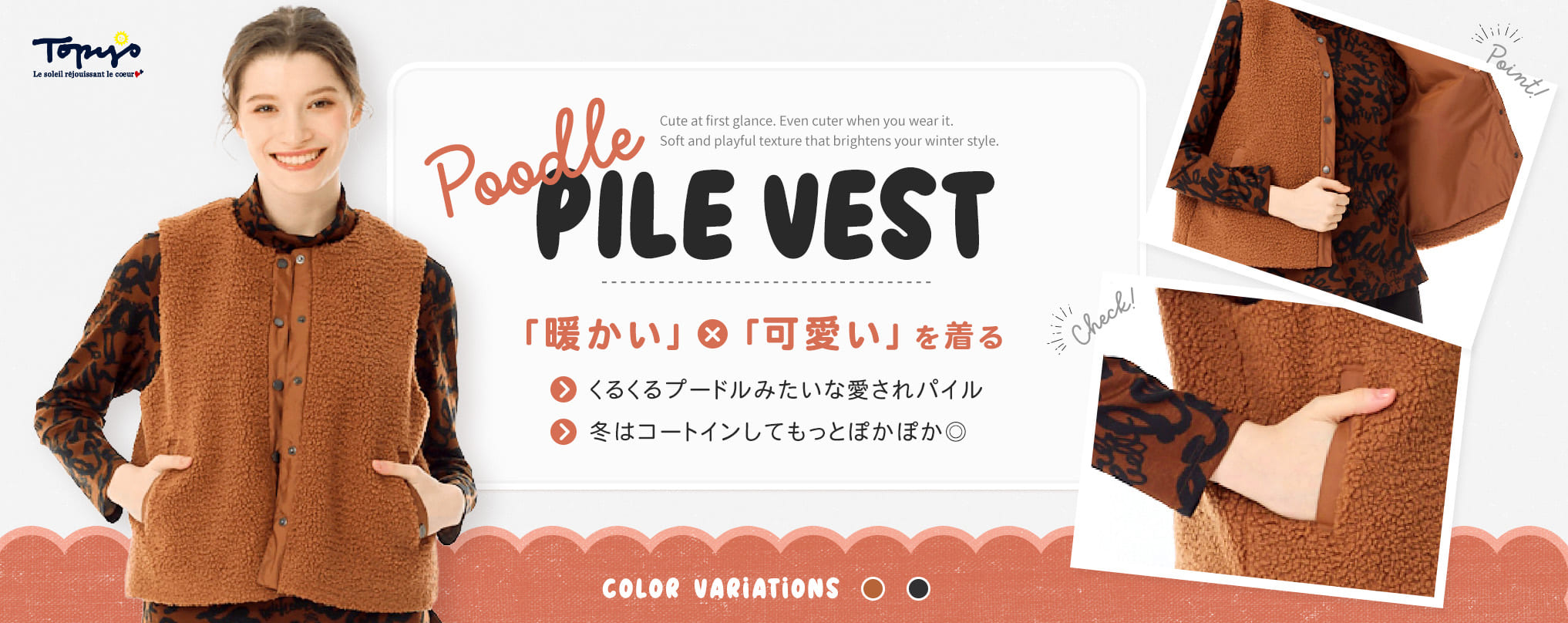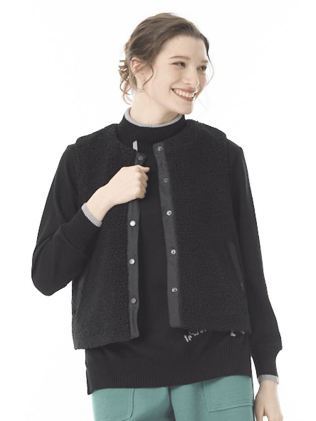 ボリュームのあるベストがスタイリングのキャッチとなり、お洒落見えも叶います。