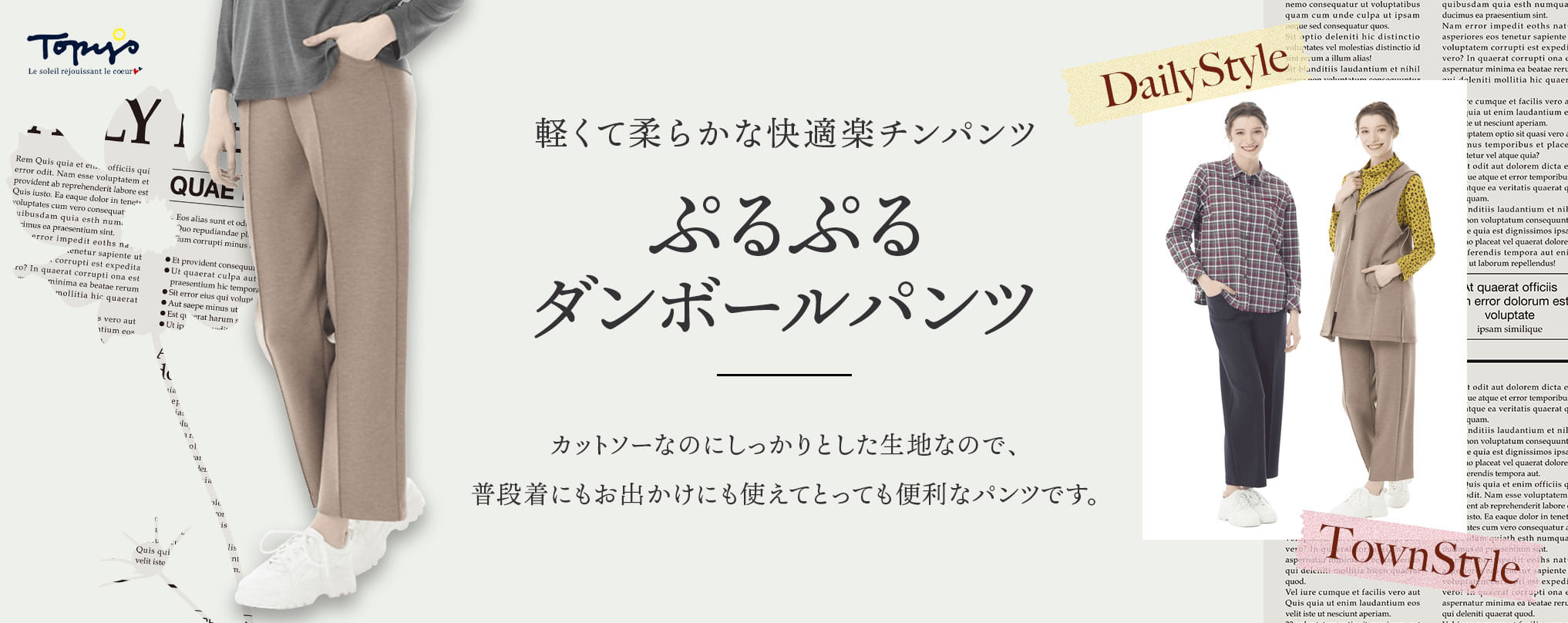 着心地を最優先に、流行にとらわれず、オフタイムを楽しむ、大人の女性のカジュアルウェアを提案します。 Topysブランドの展開レギュラーサイズは、40号(11~13号)になります。 |