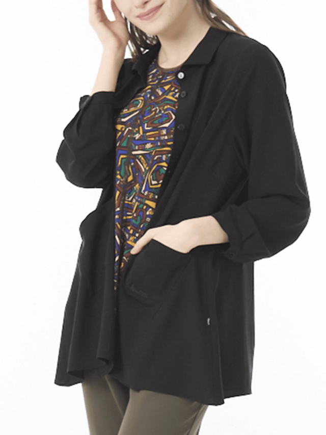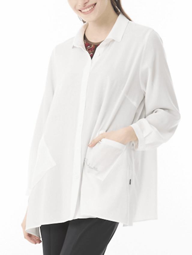 シルクのような光沢感と肌触りが特徴のアセテート生地に、シボ感を付ける加工を施したロングブラウス。ボリュームあるシルエットで落ち感もあり、羽織りとしても、一枚着としてもお洒落を演出します。