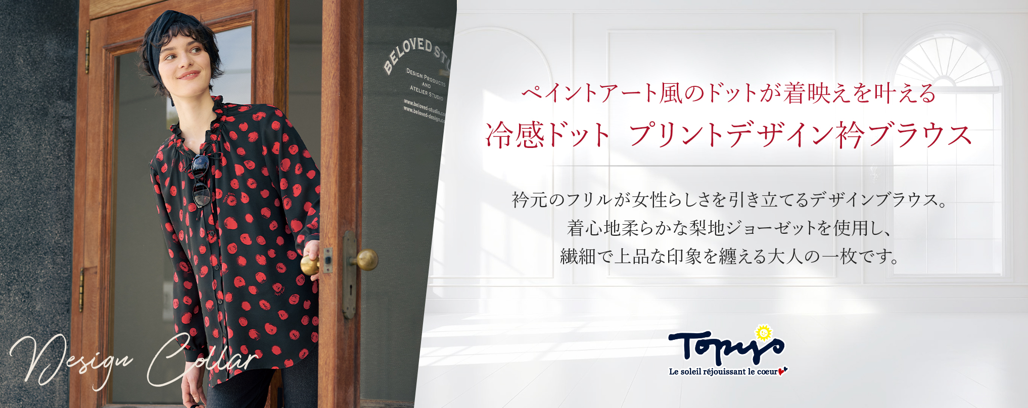 着心地を最優先に、流行にとらわれず、オフタイムを楽しむ、大人の女性のカジュアルウェアを提案します。 Topysブランドの展開レギュラーサイズは、40号(11~13号)になります。 |