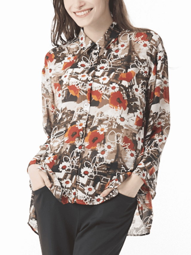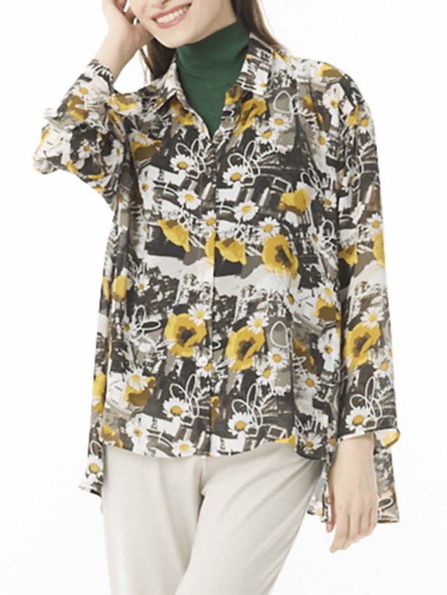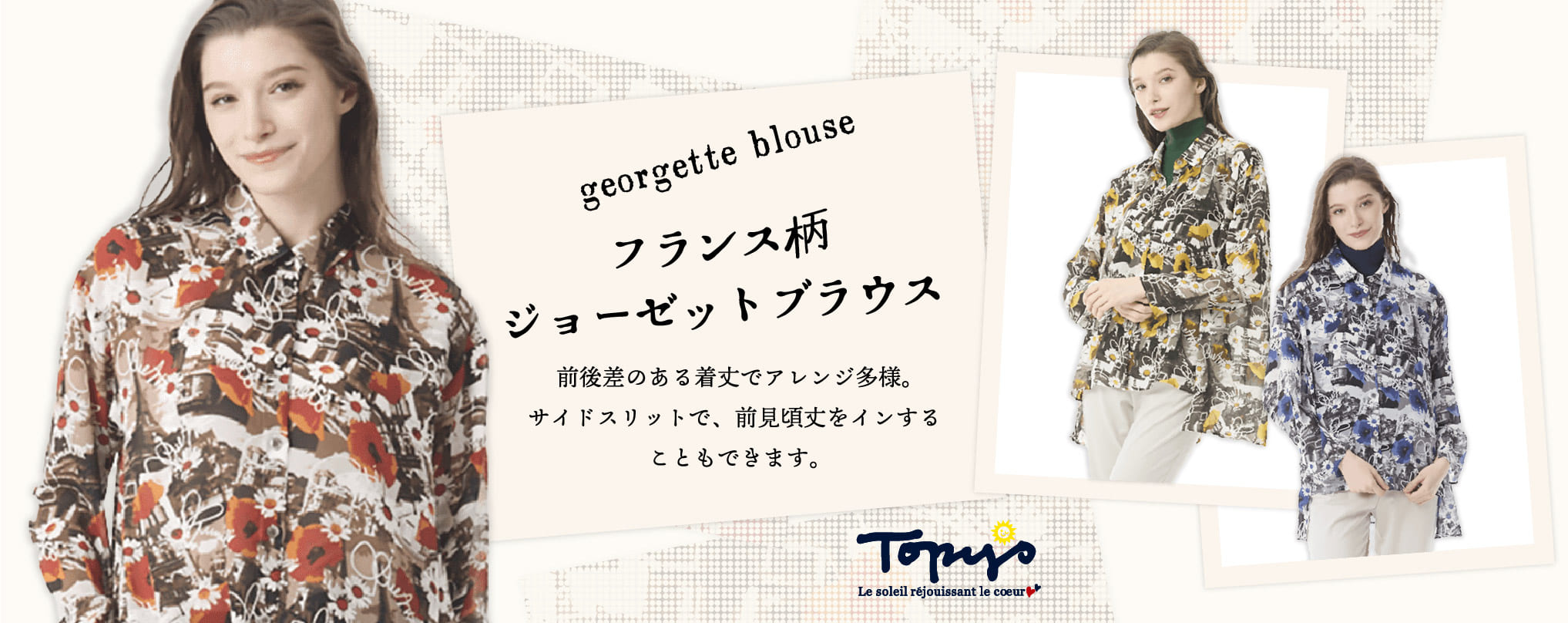 イージケアが魅力のジョーゼットをプリント下に使用しています。フランスモチーフを大胆に描いていますが、透け感のある素材とマッチした柄行に仕上がっています。