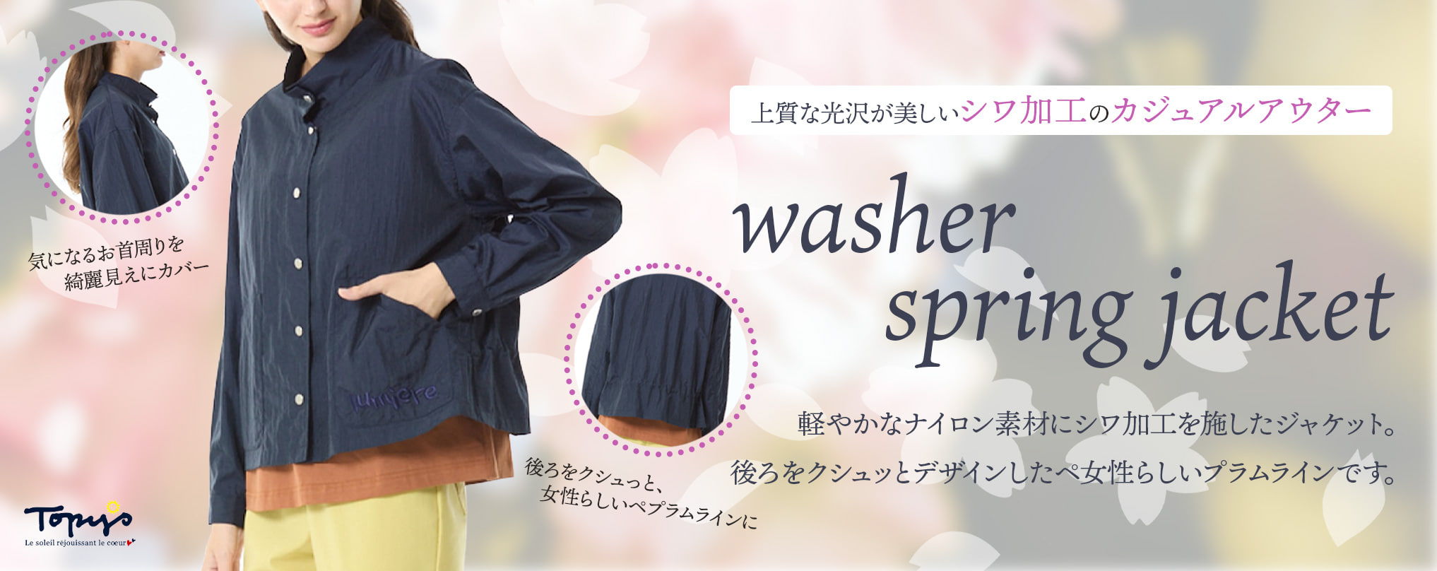 着心地を最優先に、流行にとらわれず、オフタイムを楽しむ、大人の女性のカジュアルウェアを提案します。 Topys Plusブランドの展開レギュラーサイズは、46号(15~17号)になります。 40号サイズ(11~13号)の商品は、Topysコーナにて販売しております。 |