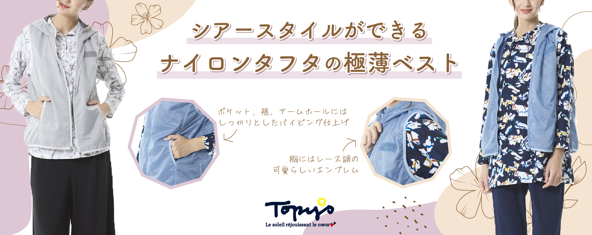 着心地を最優先に、流行にとらわれず、オフタイムを楽しむ、大人の女性のカジュアルウェアを提案します。 Topys Plusブランドの展開レギュラーサイズは、46号(15~17号)になります。 40号サイズ(11~13号)の商品は、Topysコーナにて販売しております。 |