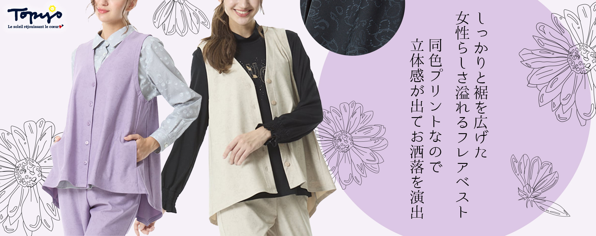 着心地を最優先に、流行にとらわれず、オフタイムを楽しむ、大人の女性のカジュアルウェアを提案します。 Topys Plusブランドの展開レギュラーサイズは、46号(15~17号)になります。 40号サイズ(11~13号)の商品は、Topysコーナにて販売しております。 |
