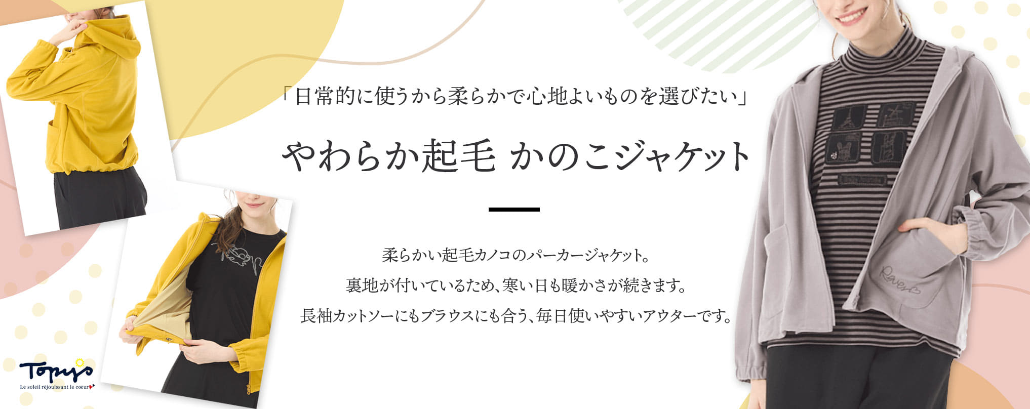 着心地を最優先に、流行にとらわれず、オフタイムを楽しむ、大人の女性のカジュアルウェアを提案します。 Topys Plusブランドの展開レギュラーサイズは、46号(15~17号)になります。 40号サイズ(11~13号)の商品は、Topysコーナにて販売しております。 |