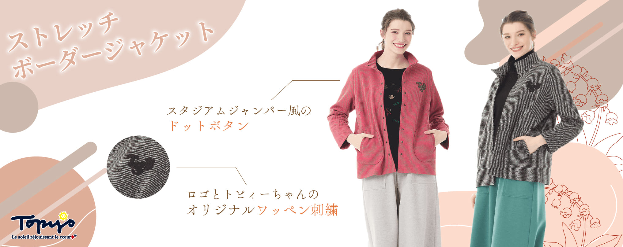 着心地を最優先に、流行にとらわれず、オフタイムを楽しむ、大人の女性のカジュアルウェアを提案します。 Topys Plusブランドの展開レギュラーサイズは、46号(15~17号)になります。 40号サイズ(11~13号)の商品は、Topysコーナにて販売しております。 |