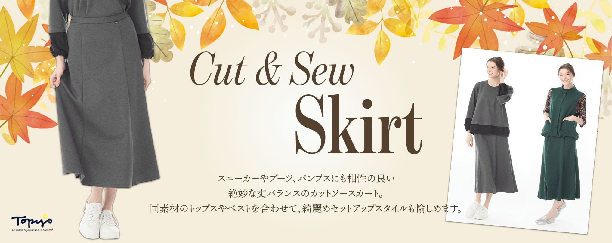 伸びるポンチ素材で動きやすく快適なカットソースカート。