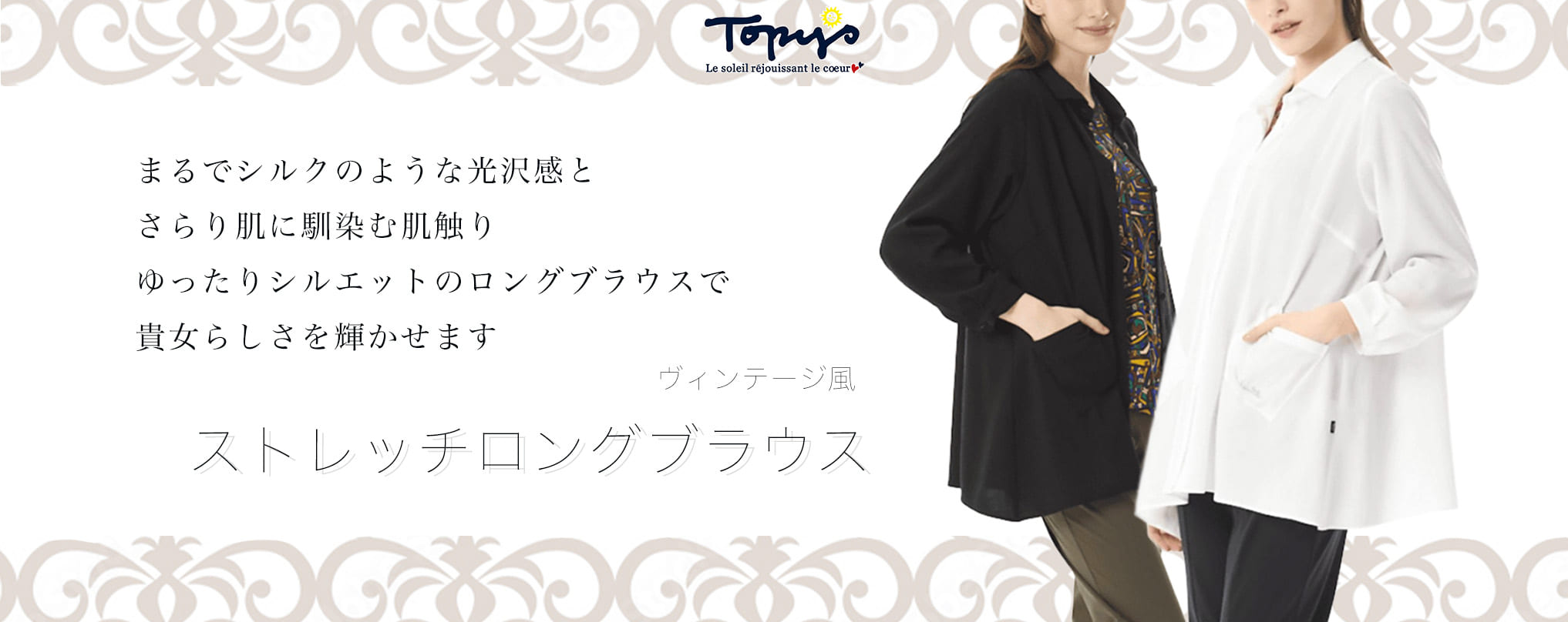 着心地を最優先に、流行にとらわれず、オフタイムを楽しむ、大人の女性のカジュアルウェアを提案します。 Topys Plusブランドの展開レギュラーサイズは、46号(15~17号)になります。 40号サイズ(11~13号)の商品は、Topysコーナにて販売しております。 |