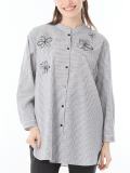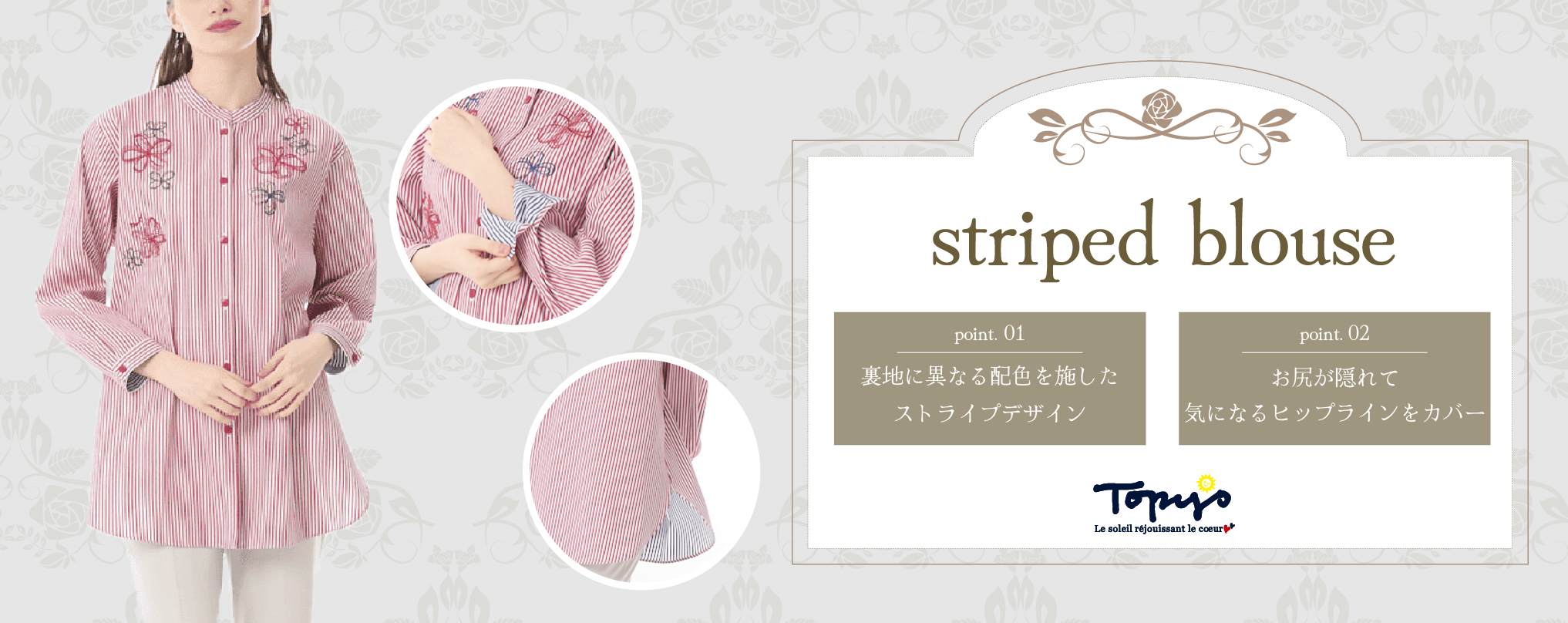 お花のプリントが可愛らしい、ポコポコとしたストライプのチュニックブラウス。