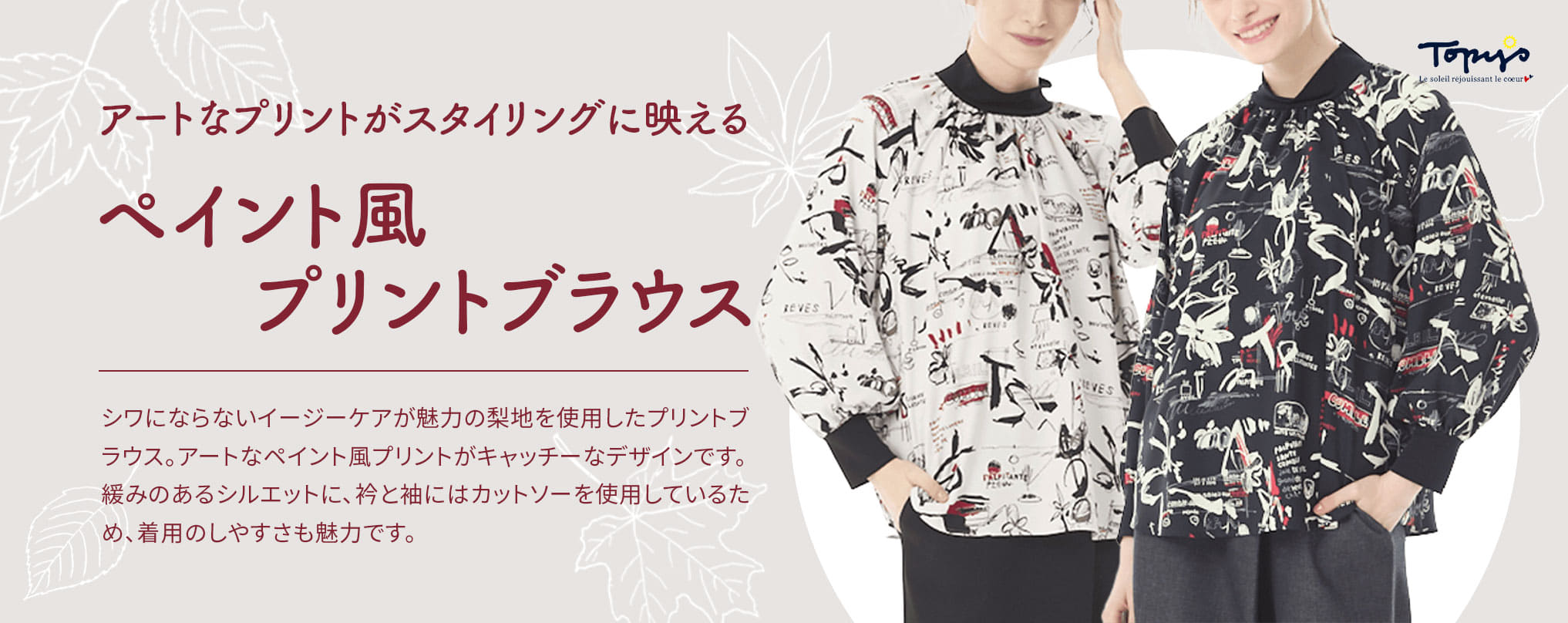 シワにならないイージーケアが魅力の梨地をプリント下に使用しています。海外図案を思わせる構図をトピィーズ風に落とし込んだプリントです。