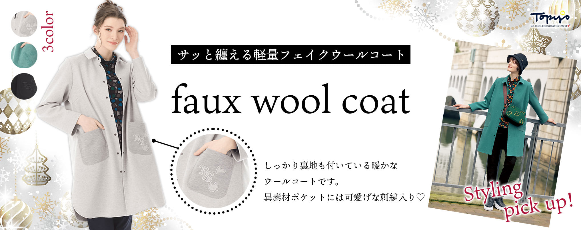 コートの上に中綿ベストなども着用できるため、気温に応じてアウターのレイヤードも愉しめるアイテムです。
