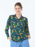 ペイズリー柄とパイナップルを組み合わせたオリジナルプリントが印象的。金属ボタンのついた衿がさりげないアクセントとなり、カジュアルの中に上品さをプラスする一枚です。