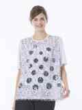 チュール素材にロゴを敷き詰めたプリントを重ねた、デザイントップス。