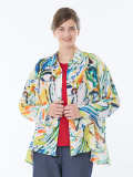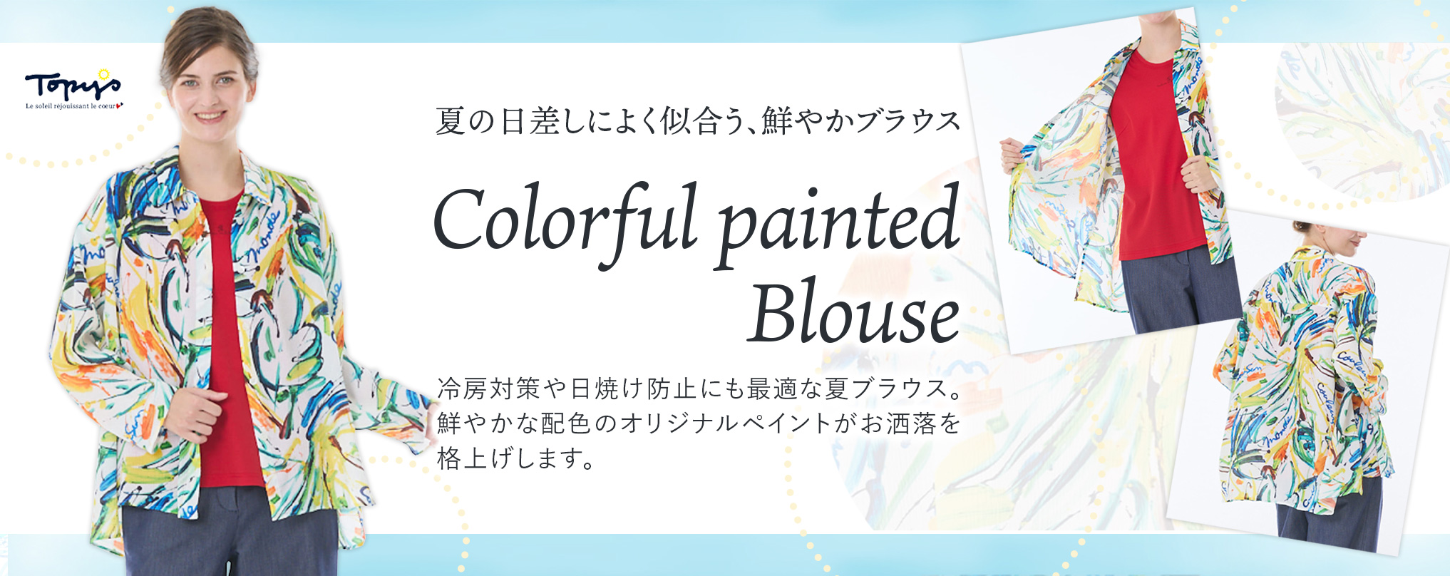 ポリエステル楊柳素材に、大胆なペイントタッチで表現したオリジナルプリントのブラウス。鮮やかな色使いが印象的で、お顔映えし、リゾート感のある華やかな一枚です。